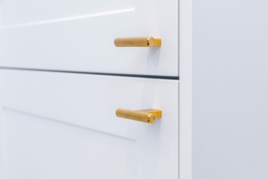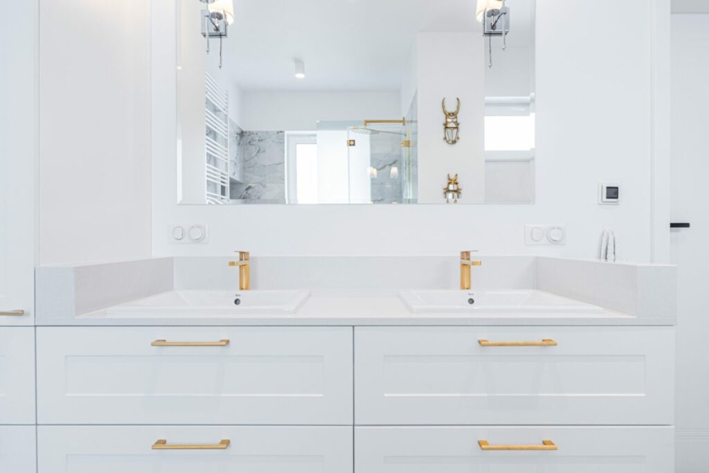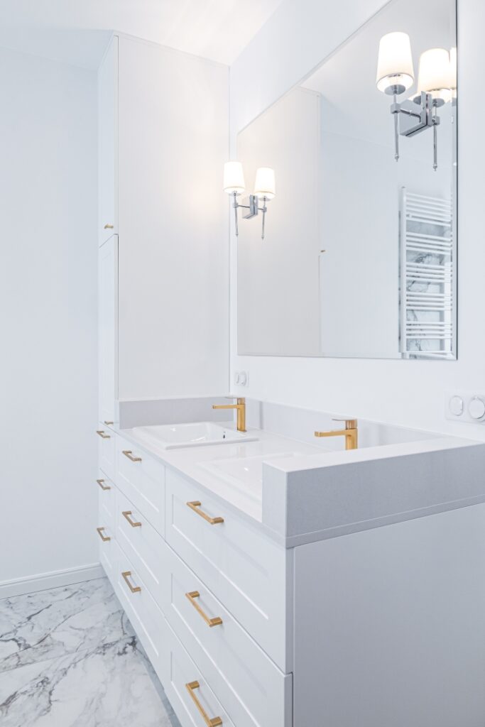 Lors de la conception d’une salle de bain de style glamour, nous nous sommes concentrés sur une combinaison de meubles encastrés blancs minimalistes avec des accessoires dorés.