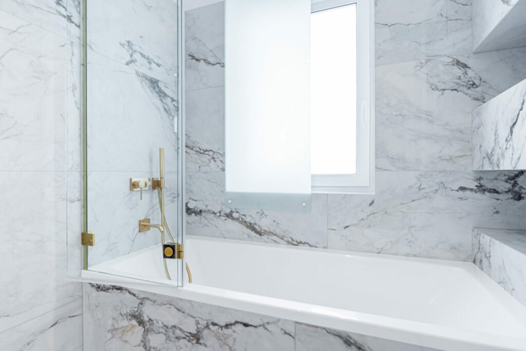 Les poignées dorées et les accessoires de salle de bain créent une impression de splendeur sans effort et d’élégance chic. Ces formes minimalistes sont complétées par des carreaux grand format imitant le marbre calacatta. Des « veines » dorées et brunes sur les carreaux complètent le mobilier classique avec une touche de splendeur.